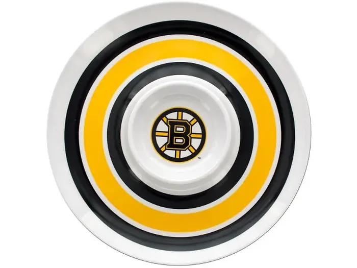 This NHL Licensed Boston Bruins Chip & Dip is ideal for any gathering, bringing both functionality and team spirit to your home. The round white plastic design features eye-catching black and yellow stripes with a 5.5" center dip section adorned with the iconic Bruins logo. Measuring approximately 14" in diameter, it is perfect for serving snacks at parties or casual get-togethers.
