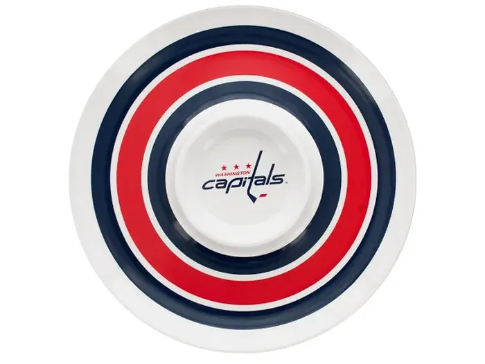Elevate your game day gatherings with this NHL Licensed Washington Capitals Chip & Dip serving dish. Designed for both parties and casual meals, this round plastic dish features vibrant red and blue stripes along the edge, alongside a prominent Capitals logo in the dip section.