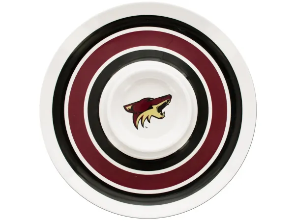 The center dip section, adorned with the iconic Diamondbacks logo, measures 5.5 inches, making it perfect for your favorite dips, salsas, or sauces. The tray has an overall diameter of approximately 14 inches and is made from durable, dishwasher-safe plastic for easy cleanup.