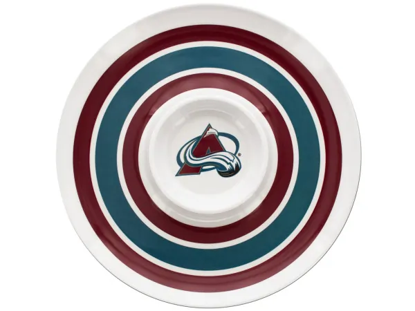 Elevate your next party or game day gathering with this MLB Licensed Colorado Rockies Chip & Dip Serving Platter. Featuring a stylish design with dark purple and black stripes, this round white plastic dish boasts a 5.5" center dip section adorned with the iconic Rockies logo.