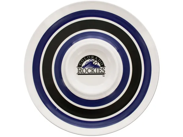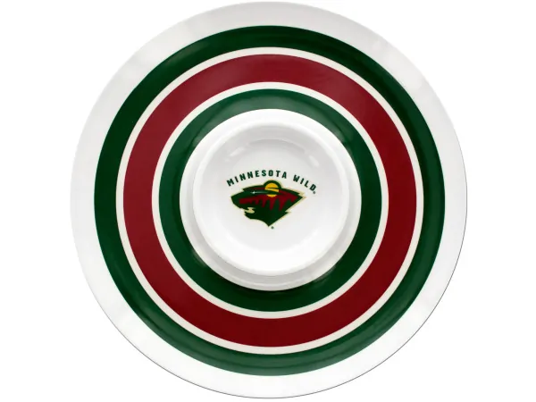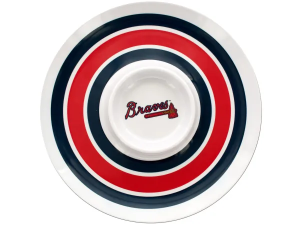Serve your snacks in style with this officially licensed Minnesota Twins Chip & Dip platter. Featuring a round white plastic design adorned with the classic dark blue and red stripes, this serving dish includes a 5.5" center dip section that prominently displays the Twins logo. Whether it's a game day or a casual gathering, this versatile platter is perfect for parties and everyday use.
