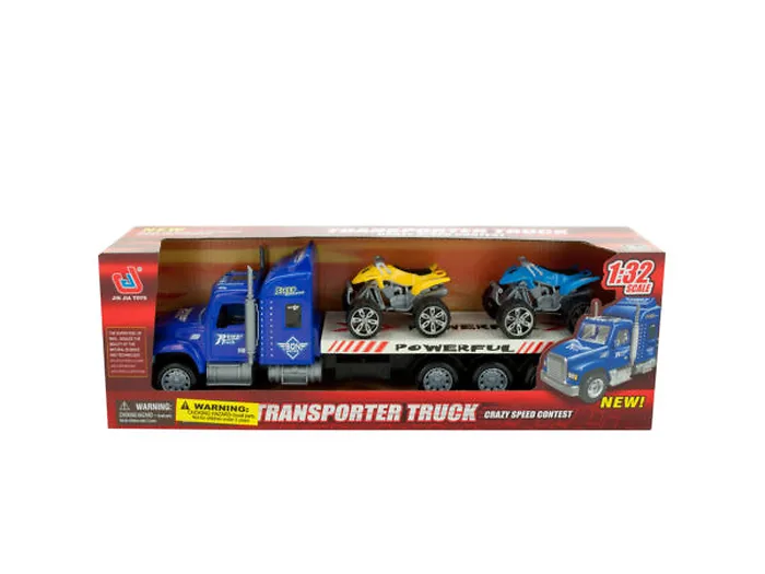 Great for hours of indoor or outdoor play this Friction Powered Toy Trailer Truck with ATVs features realistic vehicles with decals. Truck has friction powered back wheels. No need for batteries. For ages 3 and up. Comes packaged in an individual window box. Box measures approximately 16.25" x 3.625" x 5.375". Colors: blackgreywhiteyellowbluesilverCondition : This item is brand new unopened and sealed in its original factory box.