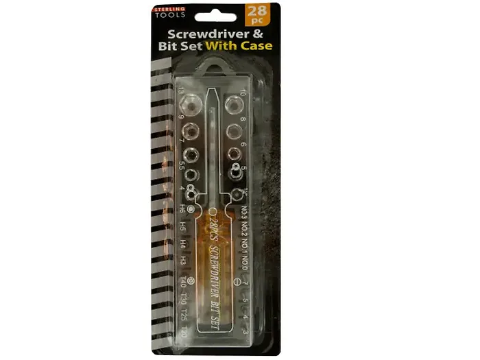 This 28-piece Screwdriver & Bit Set is an essential addition to any toolkit. The robust metal screwdriver features a comfortable plastic handle with a built-in storage compartment and a magnetic base for convenience.