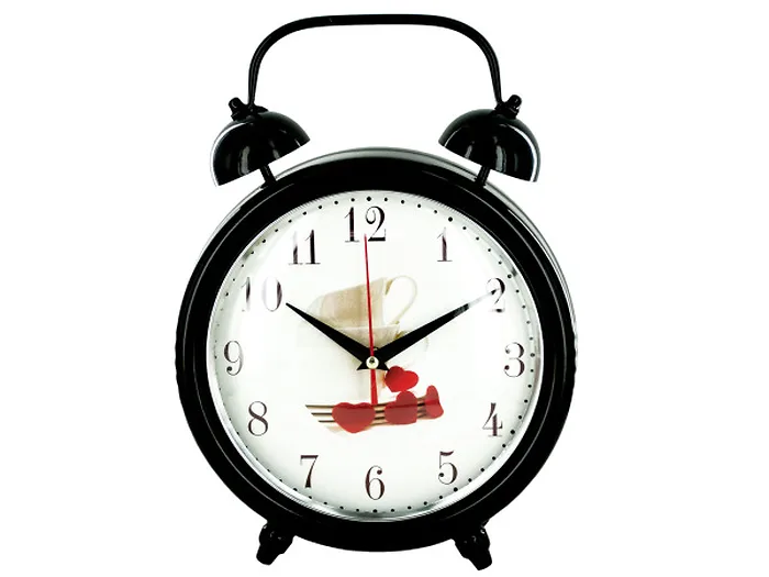 Great for any tabletop, this Decorative Metal Desk Clock features a metal clock with a classic alarm clock look and a white clock face with an image of teacups and red hearts. Measures approximately 9.25" in diameter. Bells are for decorative use only. Requires 1 'AA' battery (not included). Comes packaged in an individual box.