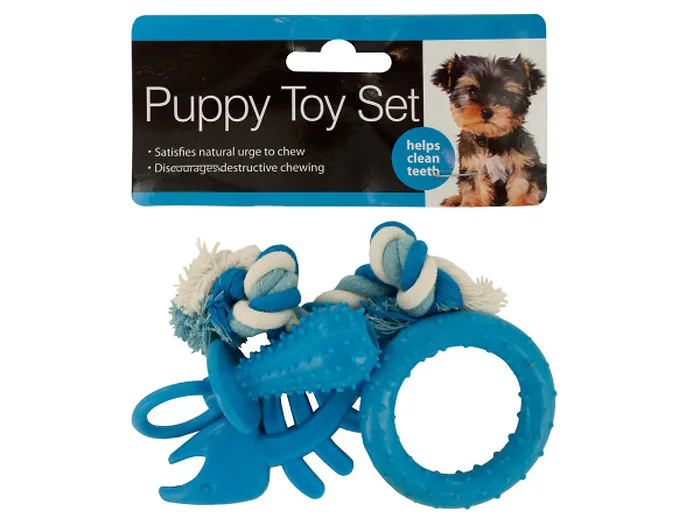 Satisfy puppies' natural urge to chew and discourage destructive chewing with this 4-piece Puppy Teeth-Cleaning Toy Set featuring a cotton knotted rope toy, textured pacifier chew toy with bell, fishbone chew toy and textured chew ring toy. Comes packaged in a poly bag with a header card.