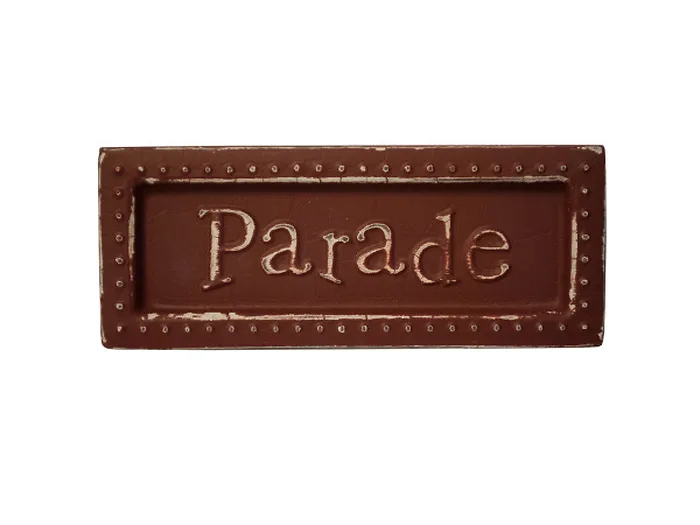 Great for decorating small spaces, this Parade Mini Metal Sign Magnet features a distressed painted metal sign embossed with "Parade" and a dotted border. Includes a large magnet and a wire hanger on back. Measures approximately 5" x 2". Comes packaged in a poly bag.
