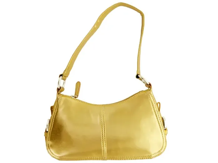 Elevate your style with this Chic Metallic Gold Handbag. Designed for those who love a touch of glam, this handbag features a small yet spacious structure with elegant buckle accents on the sides. It includes a convenient outer zipper pocket for quick access and an inner zipper pocket for secure storage. The handbag measures approximately 9.5" x 3" x 5.25" and features a comfortable 7.5" drop strap, making it perfect for any occasion.