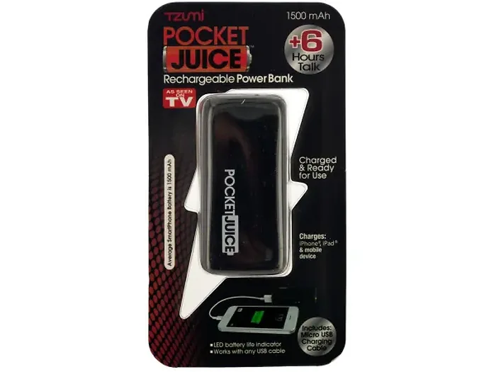 Stay powered up while on the move with the Compact Black Pocket Juice Rechargeable Power Bank. This portable power bank is designed to provide backup power to your iPhones, smartphones, digital cameras, portable games, and MP3 players. With the included micro USB cable featuring dual connectors, charging is a breeze across various devices. Enjoy up to 6 hours of additional talk time for your phone.