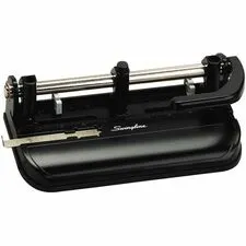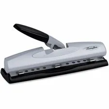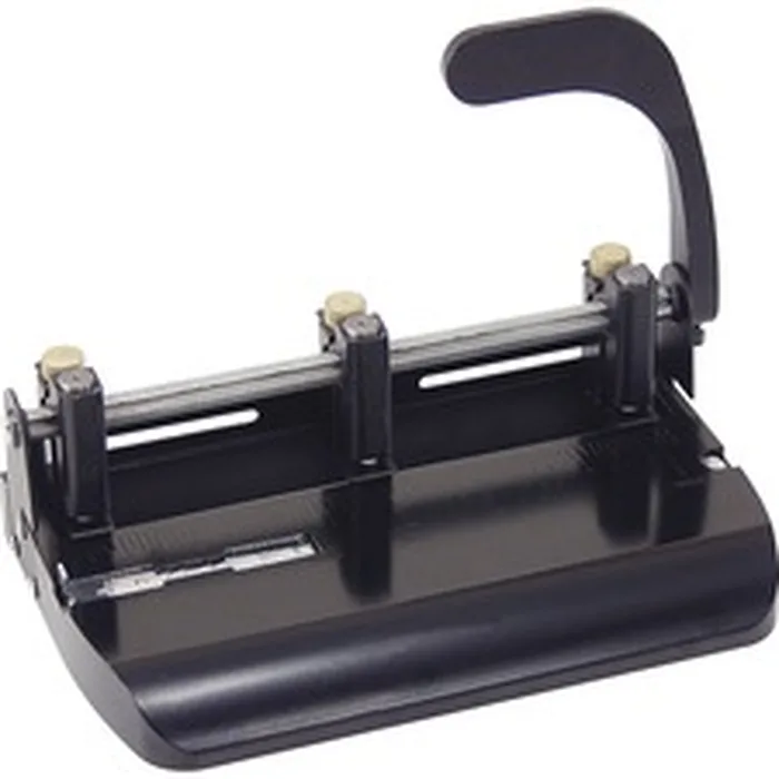 Heavy-duty hole punch features an ergonomic lever handle for easy punching of 9/32" holes in up to 32 sheets of 20 lb. paper. Three adjustable punch heads deliver 2-hole or 3-hole punching. Design also features an adjustable paper guide and easy-to-empty chip tray. Jam-free hole punch offers an all-metal construction for durability.