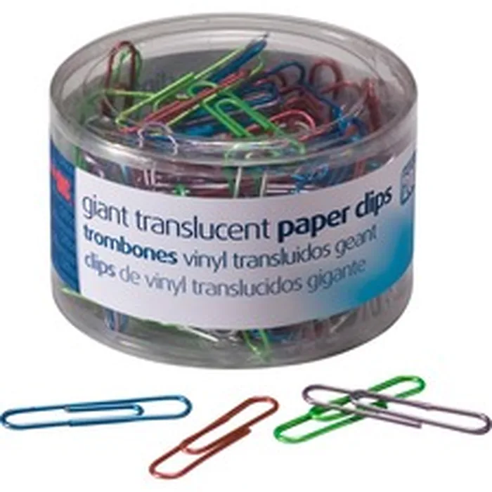 Translucent Vinyl Paper Clips won't leave marks on paper. Paper clips offer superior holding power with a translucent metallic finish. Assorted colors include blue, purple, green, red and silver.