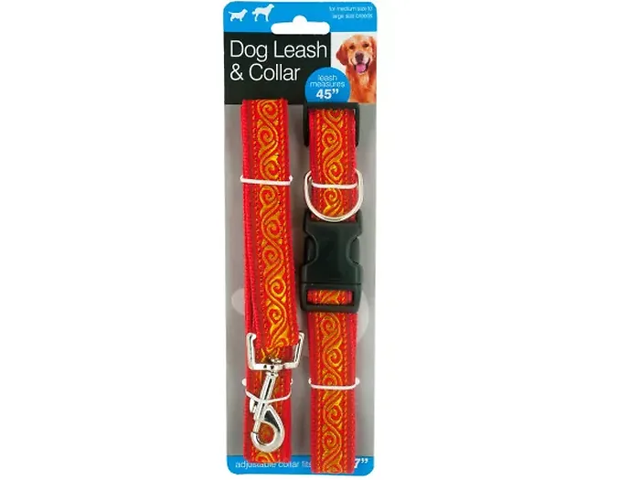 Introduce elegance to your dog's walks with our Stylish Adjustable Dog Leash & Collar Combo Set. This 2-piece set is crafted from durable nylon and features a chic embroidered ribbon overlay. The leash is equipped with a sturdy metal collar connector, while the adjustable collar includes a metal leash loop and a reliable plastic snap buckle.