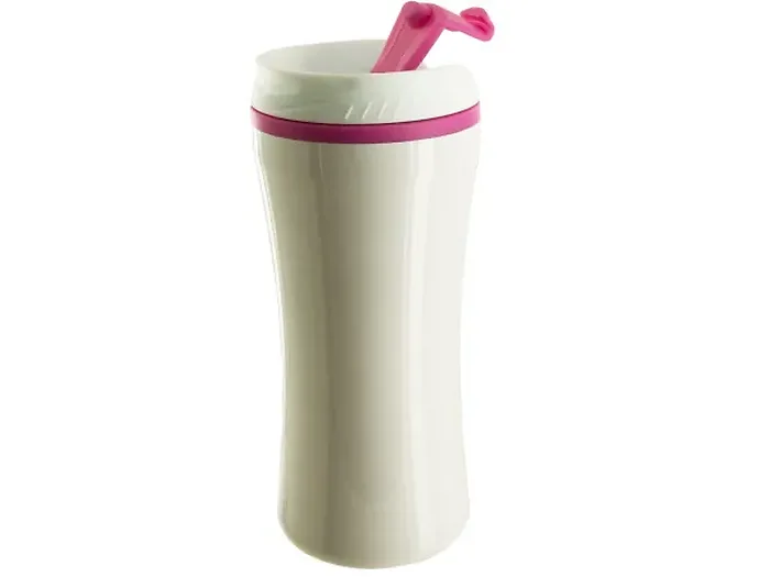 Enjoy your drinks on the go with our Stylish Pink and White Travel Coffee Tumbler! This 15-ounce tumbler is designed with a durable plastic double-walled construction that keeps your beverages hot or cold longer. Its unique hourglass shape not only looks great but also makes it easy to hold. The twist-off lid features a flip top to prevent spills, ensuring a mess-free experience.