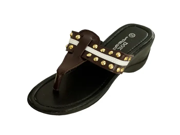 Step out in style with these Stylish Brown Wedge Sandals with Spike Accents. Designed for comfort and versatility, these sandals feature durable vinyl thongs adorned with eye-catching gold spike studs and chic white stripes. The contoured plastic wedge soles provide both support and an anti-slip texture, making them perfect for any occasion.