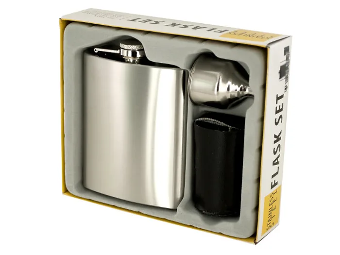A great gift for a party on the go, this 7-piece Stainless Steel Flask Set features a strong metal flask in a classic shape with an assortment of useful accessories. Includes: 1 - 7 ounce flask, 4 - 1 ounce shot glasses, 1 - easy pour funnel and 1 - soft plastic shot glass case. Comes packaged in an individual window box. Box measures approximately 7" x 1.625" x 5.75".