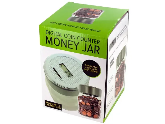 Designed to accept all U.S. circulated coins, the jar measures approximately 6.5 inches tall with a 4.5-inch diameter lid and a 4.75-inch diameter base. The jar requires 2 AA batteries (not included) for the digital display to function. Packaged in an attractive individual box that measures approximately 5.25 x 5.25 x 7 inches, this coin counter jar makes a perfect gift for any savings enthusiast.