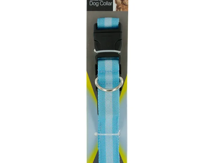 Perfect for night walks or staying safe any time, this Flashing LED Night Safety Dog Collar features an adjustable woven nylon collar with an LED light strip inside that is activated with a push button and a metal collar connector. LED light has three modes: solid, flashing and fast flashing. Designed for medium size breeds. Measures approximately 13" long. Batteries included. Comes packaged to a hanging panel.
