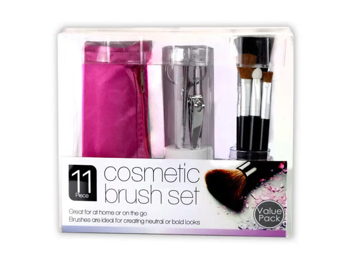 A great beauty arsenal for at home or on the go, this 11-piece Cosmetic Brush & Tool Set features high quality nail and makeup tools and a pink carry case to keep them organized in. Set includes: 1 powder brush, 1 blush brush, 1 eyeshadow brush, 1 sponge eyeshadow applicator, 1 eyebrow brush, 1 pair of scissors, 1 tweezer, 1 nail clipper, 1 steel nail file and a zippered carrying case. Comes packaged in an individual box. Box measures approximately 7" x 3.25" x 6.25".
