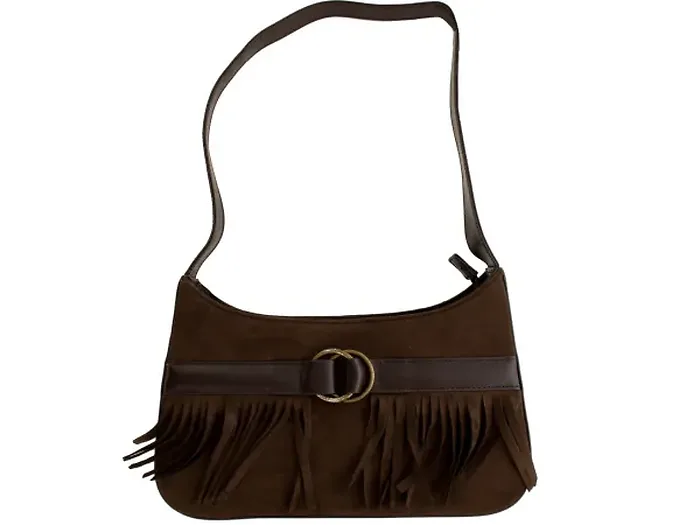 Elevate your fashion statement with this chic Brown Faux Suede Handbag, designed to infuse your outfit with Western-inspired flair. The handbag features a blend of imitation suede and leather, complemented by a stylish brass double ring belt and decorative fringe detail along the front.