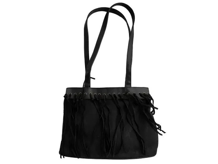 Elevate your look and stay organized with the Chic Black Faux Suede Handbag. This handbag features a sophisticated imitation suede and leather construction complemented by brass eyelets and elegant tassels adorning the front.