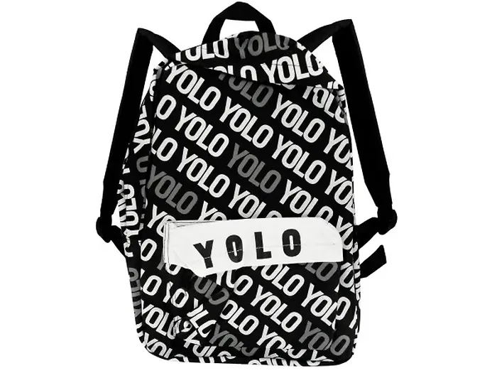 Embrace your spirit of adventure with the Adventure-Ready YOLO Backpack. This stylish and durable black nylon backpack showcases a trendy white and grey 'YOLO' print on both the front and sides, making it perfect for those who live life to the fullest.