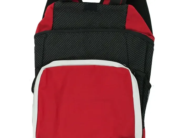 Introducing the Stylish Black & Red Nylon Travel Backpack, perfect for both travel and everyday use. This backpack boasts a sporty design made from durable nylon, featuring a combination of red, white, and dotted black panels.