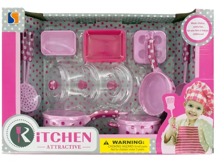 Included in the set are pots and pans with transparent lids, baking pans, and a variety of assorted cooking tools. Designed for children aged 3 and up, this kitchen play set encourages creativity and fine motor skills.