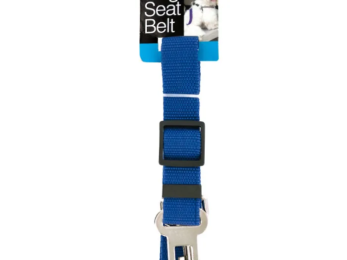 Secure your dog while traveling with this Adjustable Dog Seat Belt featuring a durable nylon belt with a metal hook to attach to collars and a metal tab that inserts into standard seat belt receptacles. Adjusts from 16" to 25". Comes in assorted colors. Comes packaged to a hanging panel.