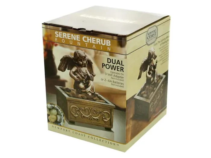 Transform your living space with the Cherubic Square Fountain, designed to bring tranquility and a touch of charm to any environment. This elegant fountain showcases a delightful cherub design with a brass-look finish, beautifully accented by a space for decorative rocks.