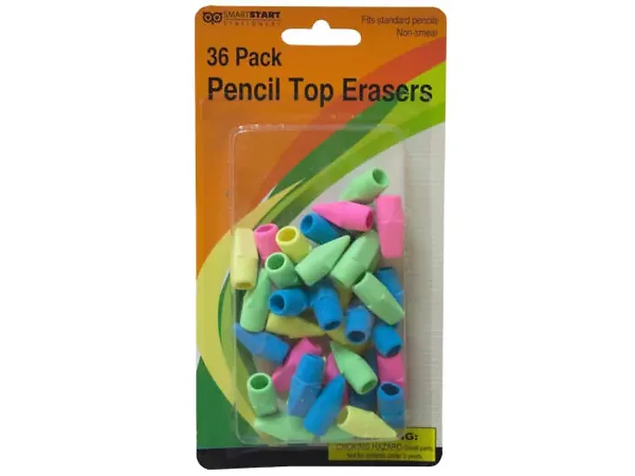 Great for home, school or office, this 36-piece Pencil Top Erasers Set features erasers in bright colors that are fun for kids. Assortment varies in pink, yellow, green and blue. Erasers measure approximately 1" long. Not recommended for children under 3. Comes packaged in a blister pack.