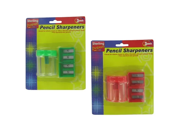 Enhance your writing experience with our assorted pencil sharpener pack. Ideal for school, home, or office use, this set includes three sharpeners: one cylindrical sharpener and two double-holed rectangular sharpeners. The rectangular sharpeners feature both standard and jumbo-sized holes, while the cylindrical sharpener is designed for standard pencils only.