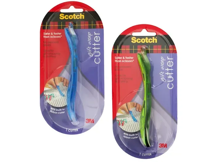 It measures approximately 5.5" x 0.5" and is available in assorted colors. Conveniently packaged for display, the Scotch Gift Wrap Cutter is a must-have for every gift-giver.