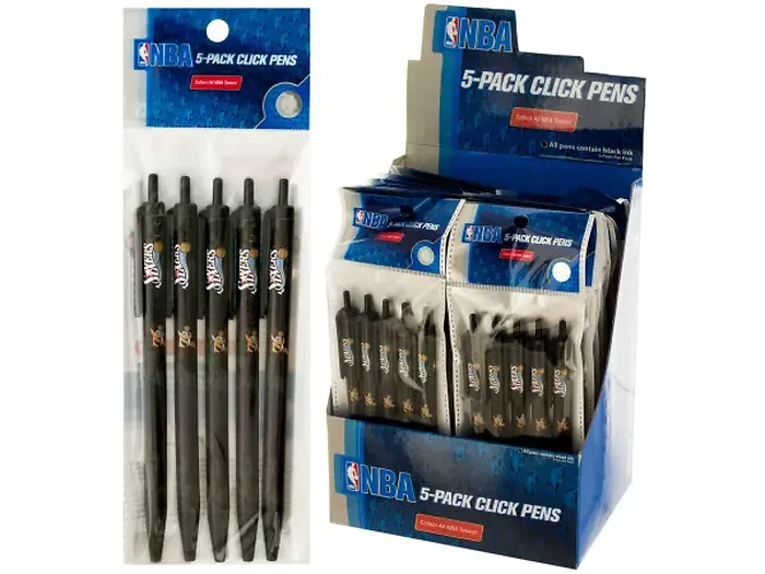 Show your support for the Philadelphia 76ers with this stylish and practical click pen set. Each pen is NBA licensed and features the official team logo, making them ideal for fans of all ages. The pens come in packs of 5 and are perfect for everyday use, school, or office. The countertop display includes 24 packs, allowing you to share them with friends or customers.