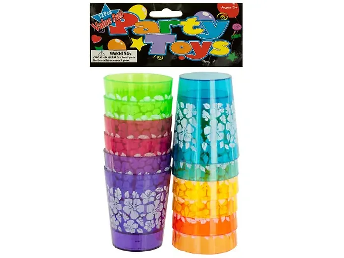 This vibrant 12-piece set features colorful, transparent plastic shot glasses adorned with beautiful white hibiscus flowers, perfect for luaus and festive occasions.