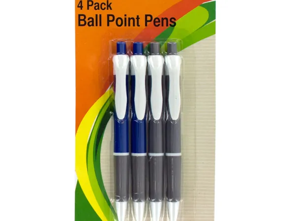 Great for home, school and office, this 6-piece Blue Medium Ball Point Pens Set features retractable medium point pens with transparent shells, comfortable textured grips and dark blue ink. Pens have clips for easy attachment to shirts, pockets and more. Comes packaged in a blister pack.