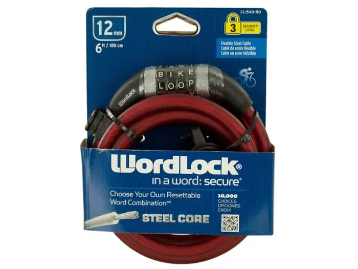 Secure your bike effortlessly with the WordLock Flexible Steel Cable Bike Lock. This innovative lock utilizes a customizable word combination for easy access, ensuring you won't forget your code. Its robust steel core cable measures approximately 12mm in diameter and extends to a generous 6 feet in length, providing ample reach for securing your bike to various objects.