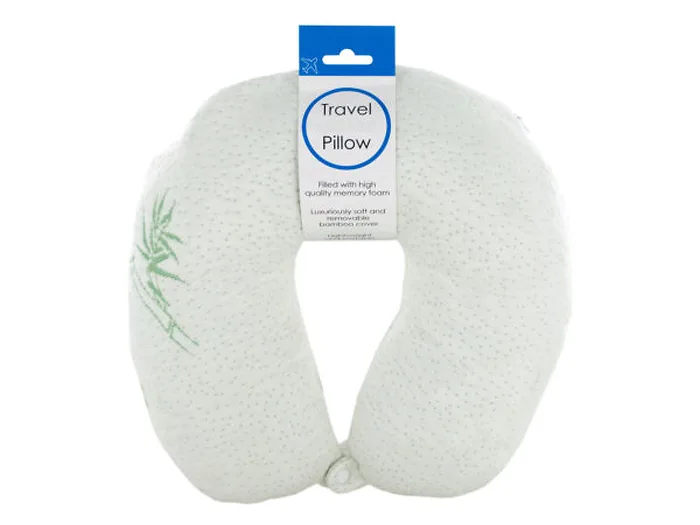 Travel more comfortably and enjoyably with this Bamboo Travel Pillow featuring a U-shaped design that lets you rest your head and neck. Pillow has a removable cover made of luxuriously soft bamboo and is filled with high quality memory foam. Pillow fits snugly around your neck for maximum support so you feel refreshed when you arrive at your destination. Measures approximately 12" x 4" x 13". Comes packaged with a wrap around.