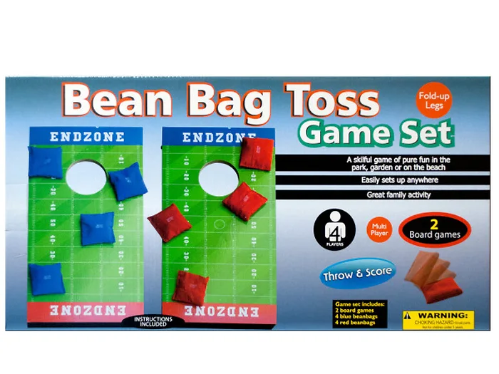 A skillful game of pure fun for the lawn, park or beach, this Toss n' Score Bean Bag Toss Game Set features wood and plastic game boards in a football field design with fold-up legs. Includes 2 board games, 4 blue bean bags and 4 red bean bags. Boards measure approximately 20.25" x 10.625". For up to 4 players. Easily sets up anywhere. Instructions included. For ages 3 and up. Comes packaged in an individual box. Box measures approximately 20.625" x 3.5" x 11.25".