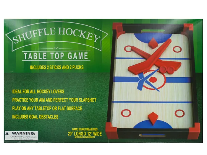 Practice your aim and reaction time with this exciting Slap Shot Hockey Tabletop Game featuring a fun game board with goal obstacles and rounded corners for rebounds to keep the puck in play. Play on any tabletop or flat surface. Includes 2 hockey sticks, 2 pucks and a wooden game board with cutout goals. Game board measures approximately 20" long x 12" wide. For ages 3 and up. Instructions included. Comes packaged in an individual box. Box measures approximately 20.5" x 2.625" x 12.5".