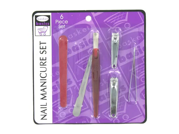 Great for at home or on the go, this 18-piece Ladies Manicure & Grooming Set features a wide assortment of high quality tools organized in a compact, shiny faux alligator skin case. Set includes: 2 cuticle pushers, 1 eyeshadow sponge brush, 2 nail files, 1 cuticle trimmer, 1 eyelash comb brush, 1 eyebrow trimming scissors, 1 ear cleaner, 1 toenail clippers, 1 small clippers, 1 large clippers, 1 tweezers, 1 mirror, 1 powder brush, 1 eyebrow brush, 1 foundation brush and 1 eyeliner brush. Case measures approximately 7" x 5". Comes packaged in an individual box. Box measures approximately 7.125" x 1.125" x 5.5".