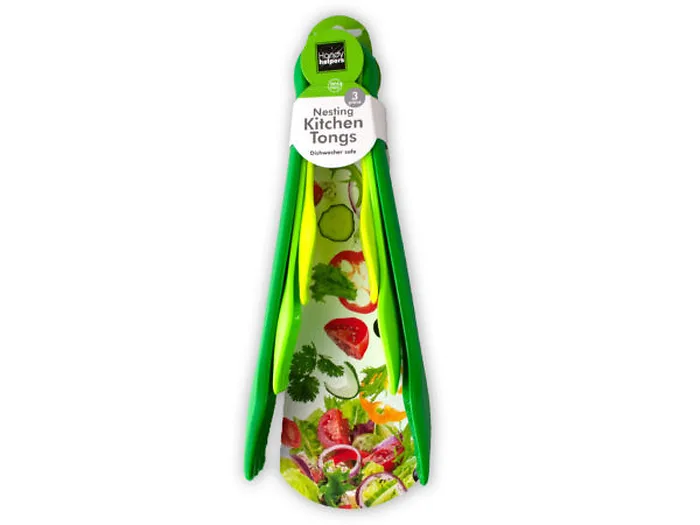 Great for ice, desserts, salads and more, this 3-piece Nesting Tongs Set features durable plastic tongs with ribbed texture for a secure grip. Tongs nest together for easy storage. Includes 3 sizes: 6", 8" and 10". Dishwasher safe. Comes in assorted colors. Comes packaged in a hanging panel.