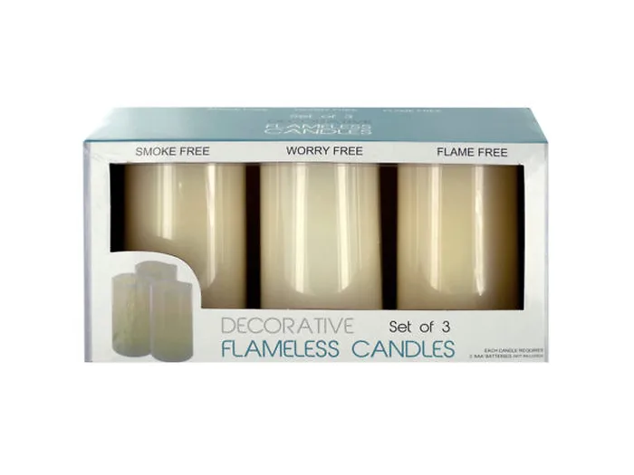 Add warm, inviting ambiance to your space with this 3-piece Decorative Flameless Vanilla Scented Candles Set featuring real wax pillar candles in a natural design with wavy top edges, a pleasant vanilla fragrance and plastic flickering flames. Candles are smoke-free, flame-free and worry-free. Candles measure approximately 5" tall. Each candle requires 3 'AAA' batteries (not included). Comes packaged in an individual box. Box measures approximately 10.5" x 3.75" x 5.5".