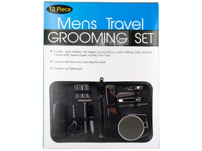Stay well groomed at home and on the go with this 12-piece Men's Travel Grooming Set featuring high quality metal and plastic tools in a convenient zippered vinyl case. Set includes: razor, 3-blade refills, tweezer, nail clipper, small nail clipper, shaving mirror, scissors, folding comb, lint brush, 3-in-1 tool and nail file. Case measures approximately 5.5" x 1" x 7.25". Comes packaged in an individual box. Box measures approximately 5.75" x 1.125" x 7.375".