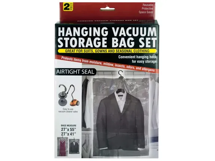 The set includes two bags, perfect for storing suits, gowns, and seasonal clothing. Each bag features airtight seals and convenient hanging hooks for effortless storage. The easy-to-use vacuum cleaner valve allows for quick air removal, ensuring a space-saving seal that helps you keep your wardrobe organized. Reusable and practical, these bags measure approximately 27" x 55" and 27" x 41".