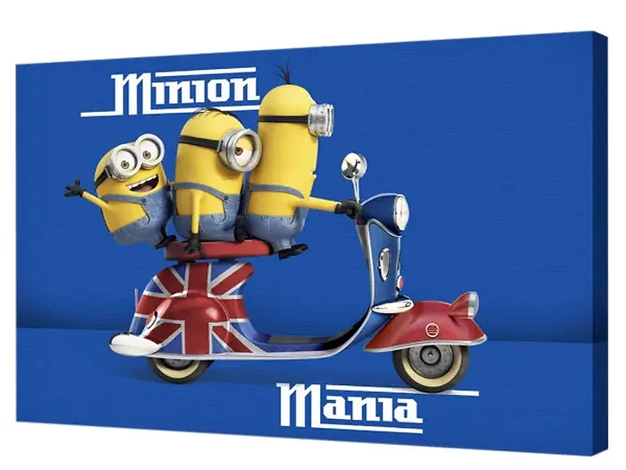 This fun and vibrant canvas art piece is perfect for children's rooms. It showcases three mischievous Minions riding a classic British scooter, accompanied by the playful phrase 'Minion Mania'. The artwork is expertly printed on a stretched canvas that wraps around a sturdy wood frame, making it a delightful addition to any kid's space.