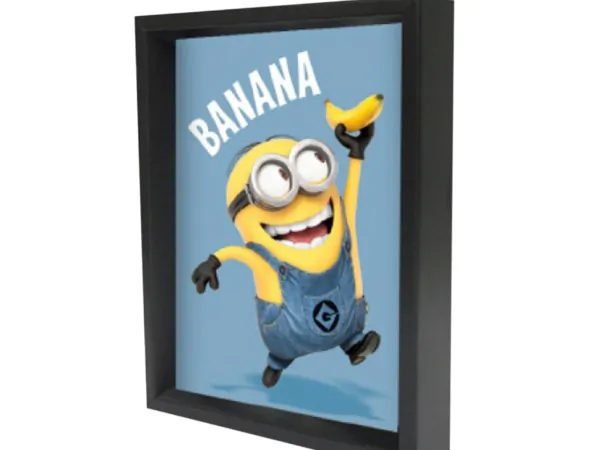 Bring fun and whimsy to your child's room with the Minions 3D Shadowbox. This delightful piece showcases vibrant 3D images of popular Minion characters set in a sleek black box frame. Perfect for decoration or as a gift, it comes with a metal sawtooth hanging bracket on the back for easy installation.