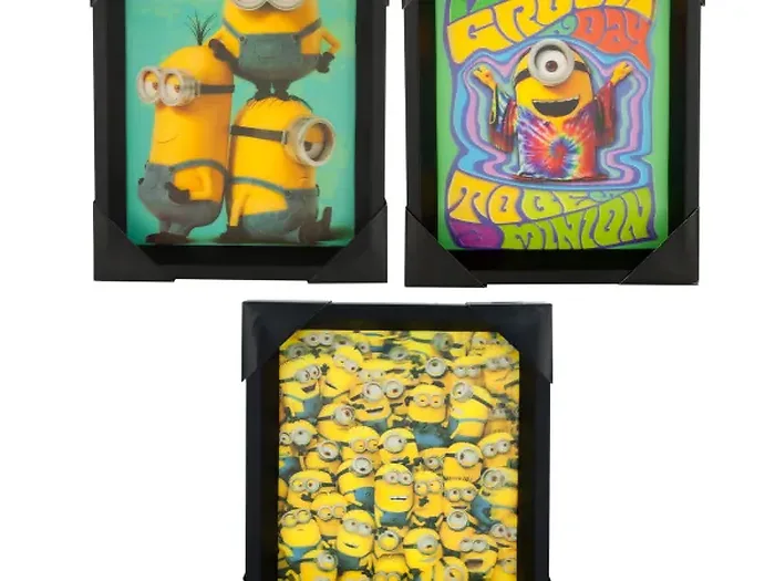 Measuring approximately 8" x 10", this shadowbox is available in assorted designs: Minions Trio, Mass of Minions, and Groovy Minion. Each shadowbox is carefully packaged with corner protectors in a bubble pouch for safekeeping.