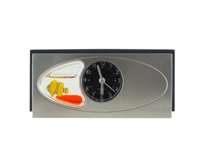 Add a whimsical touch to your decor with the Aquatic Charm Floating Fish Alarm Clock. This unique timepiece features a sleek silver plastic design paired with a classic black quartz clock face. Nestled beside the clock is a captivating floating fish in a mini water tank, making it a delightful conversation starter.