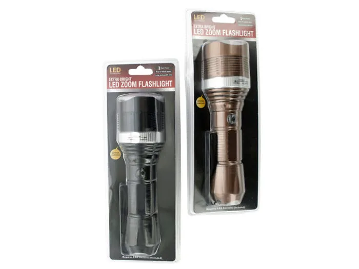 Requires 3 AA batteriesBattery not includedAdjustable focusDimmer controlFlashlight measures approximately 8.25 in. longPackaged in a clam shellMade from plasticBlack colorWeight: 0.7 lbs.Energy-saving, ultra-bright and durable, this Extra Bright LED Zoom Flashlight is a great general use flashlight. This flashlight is lightweight with heavy duty construction, an anti-slip textured body, attached nylon lanyard and soft touch on/off push bu
