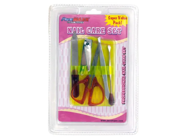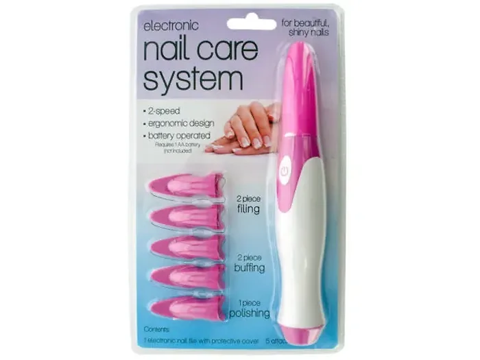 The kit comprises 1 electronic nail file with a protective cover and 5 versatile attachments (2 filing, 2 buffing, and 1 polishing). The nail file measures approximately 7.25" long and requires 1 'AA' battery (not included). Packaged conveniently in a clam shell for easy storage.