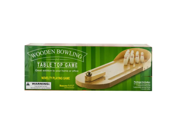 Great for a quick game at home or the office, this Table Top Wooden Bowling Game features a mini bowling game complete with realistic pins, an alley marked with guide dots and arrows, recessed gutters and a backguard. Set includes 1 wooden alley, 10 wooden bowling pins, 1 adjustable wooden aiming ramp, 1 metal bowling ball and 1 score sheet. Alley measures approximately 11.75" x 4". Comes packaged in an individual box. Box measures approximately 4.5" x 2" x 12.25".